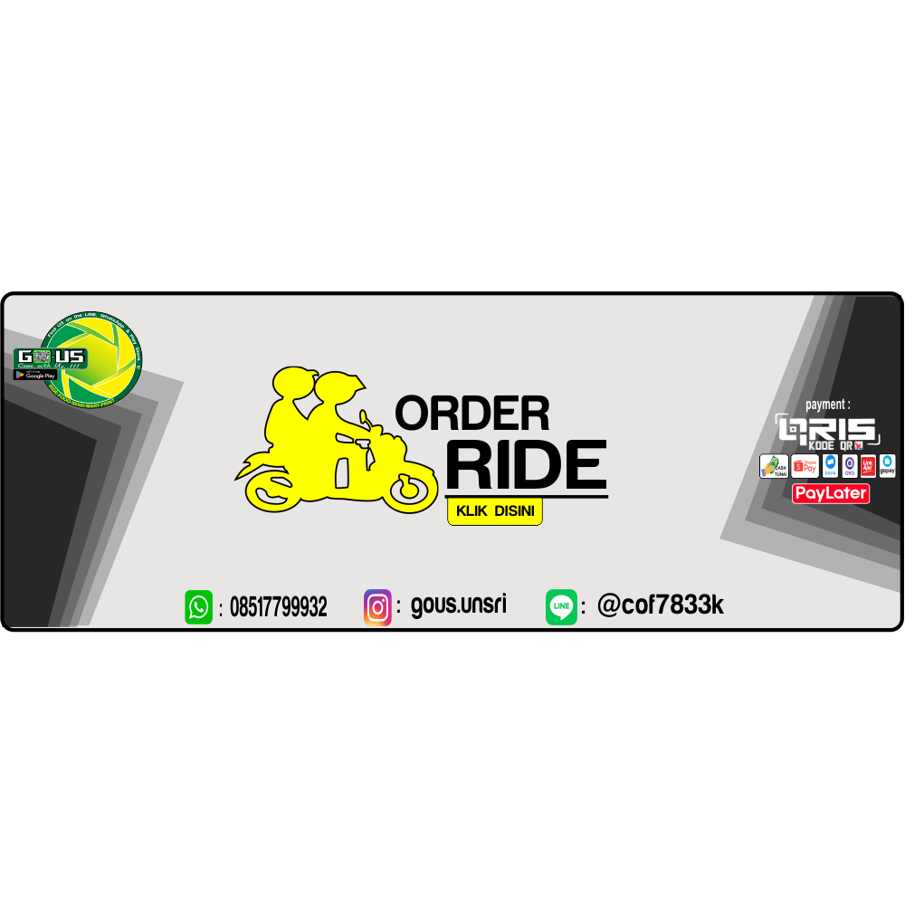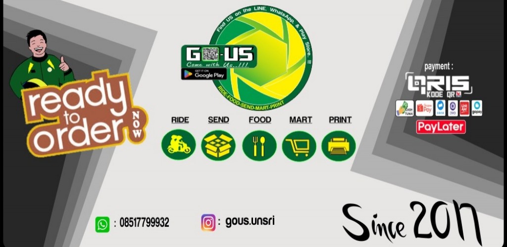 Go-US penyedia layanan Ojek Online di Indralaya berdiri sejak 2017, menyediakan jasa : Ride Food Send Mart Print