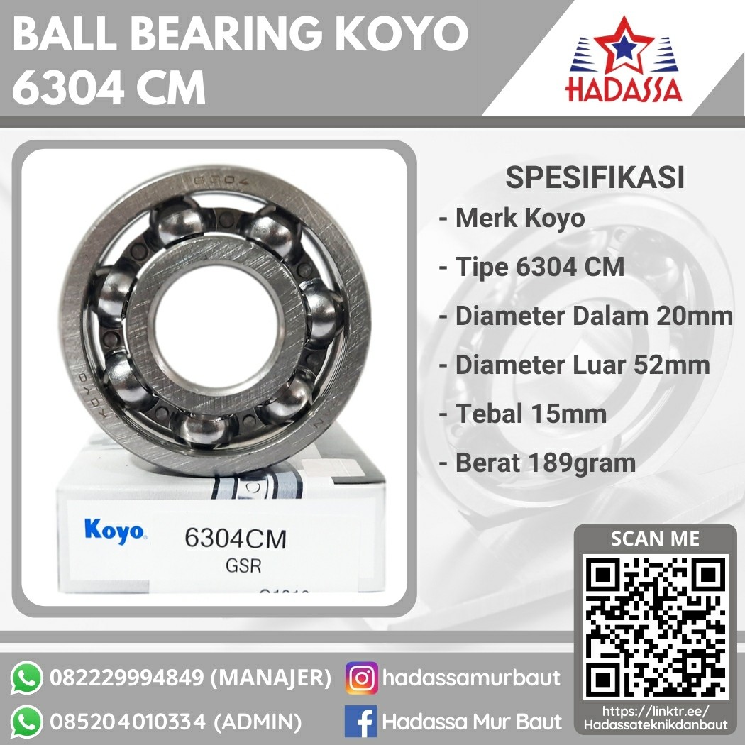Ball Bearing Koyo 6304 CM untuk mengurangi gesekan dari perputaran mesin atau roda sehingga putaran menjadi stabil. Ball bearing ini memiliki spesifikasi sebagai berikut: - Merk Koyo - Tipe 6304 CM