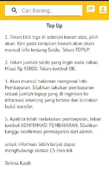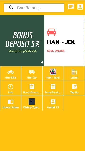 Aplikasi ojek online Han - Jek merupakan solusi tepat bagi anda yang ingin menghemat waktu untuk mengantarkan anda ke lokasi yang di tuju, pesan makanan, minuman dan jasa antar jemput barang dengan lebih mudah. Fitur-fitur kami : 1. Han-BIKE : adalah jasa antar jemput orang menggunakan kereta (motor) 2.Han-CAR : adalah jasa antar jemput orang menggunakan mobil 3. Han_SEND : adalah jasa antar jemput barang pesanan konsumen 4. Han-FOOD : adalah jasa antar dan kirim makanan 5. Han-MARKET : adalah jasa belanja barang pesanan yang di butuhkan konsumen. Terimah kasih sudah menggunakan aplikasi kami.