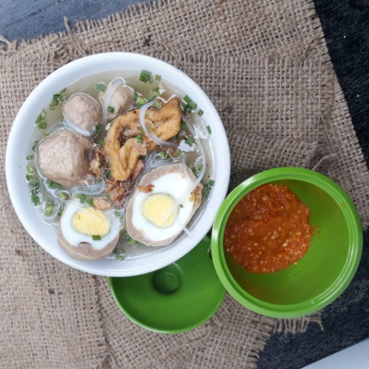 1 pentol telur, 1 pentol sedang, 2 pentol kecil + tahu daging.