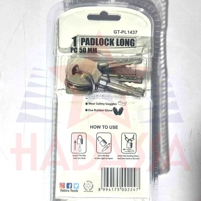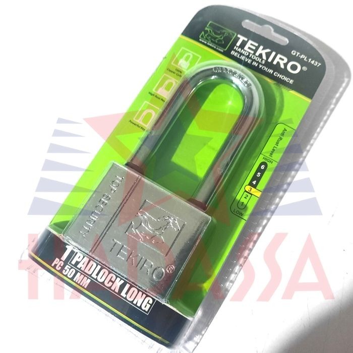 Gembok Panjang 50mm Tekiro GT-PL1437 digunakan untuk meningkatkan keamanan rumah atau tempat usaha dengan cara mengunci menggunakan gembok ketika akan meninggalkan atau menutup.